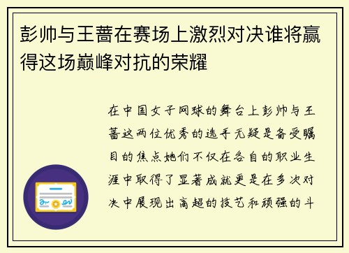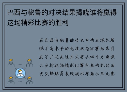 在日本职业足球联赛的激烈竞争中,山口雷与山形山的对决成为了一场不容错过的比赛。这场比赛不仅展现了球员们的高超技艺,更是足球战术博弈和团队精神较量的生动写照。通过对两队不同战术风格的分析,我们可以看到如何通过合理布局和默契配合来实现胜利。此外,这场比赛也反映了球员在压力下表现出的毅力和勇气,为观众呈现了一场精彩绝伦、扣人心弦的足球盛宴。本文将从四个方面深入探讨这场对决所揭示出的深层次意义,包括战术运...